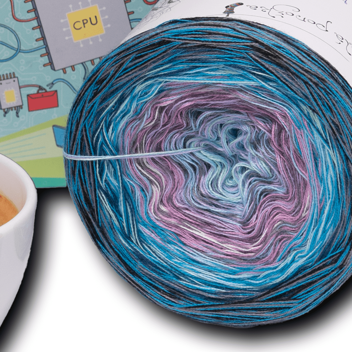 | 3 nitky | Klubíčko je ručně motáno z tří různě se měnících nitek laděných do modro fialkových barev. |
