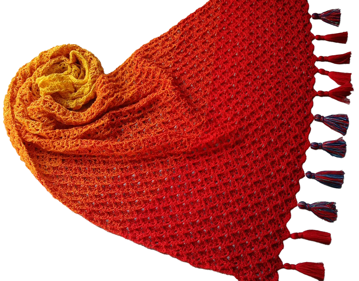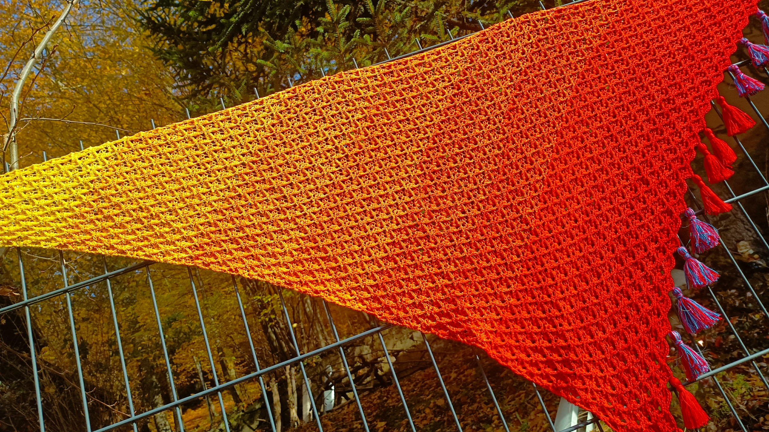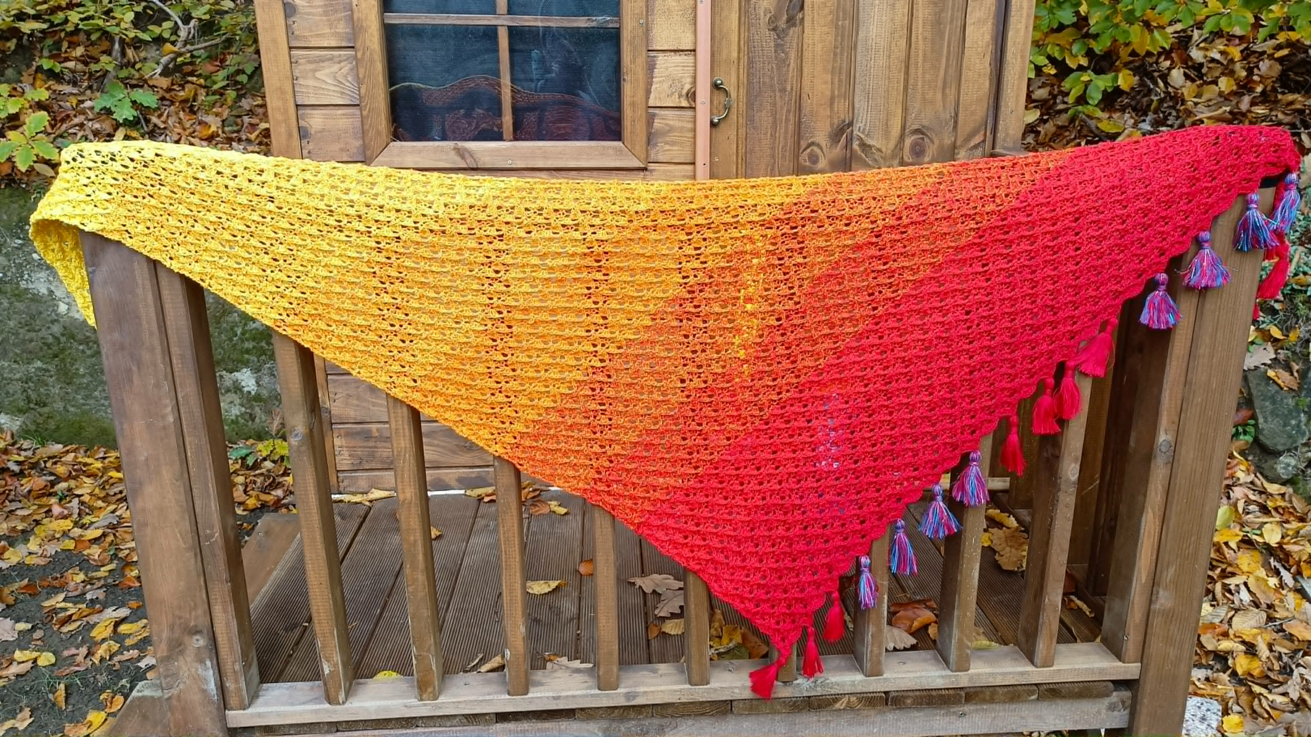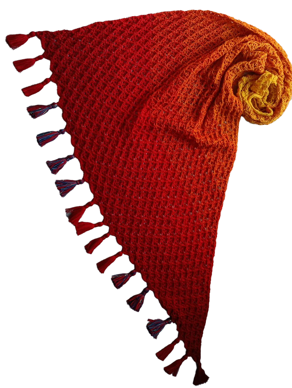 | Tvar | Výsledný šátek je atypický trojúhelník, háčkovaný od cípu |