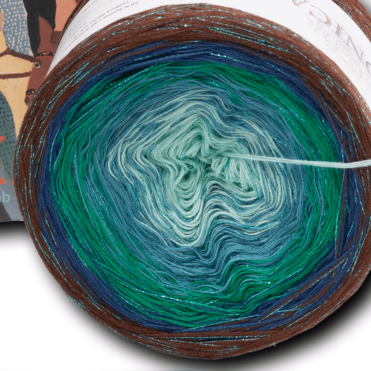 | 3 nitky + lurex | Klubíčko je ručně motáno z tří postupně se měnících nitek k dosažení efektu přecházení barev. Lurex je v barvě světle modrá. |